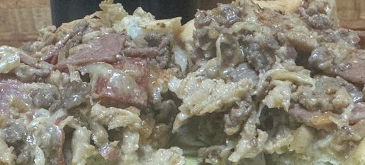 A Philly cheesesteak with steak, chicken, sausage, pepperoni, pastrami, bacon, and shrimp. Yeah, you read that right.